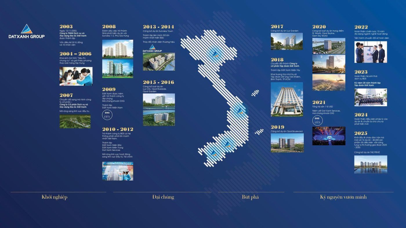 Dat Xanh Group (DXG) is one of Vietnam’s top 10 real estate developers, renowned for its strong financial capacity, construction quality, and proven track record. Over two decades of growth, the Group has successfully delivered numerous landmark projects such as Lux City, Lux Garden, Opal Riverside, Opal Boulevard, Opal Skyline, ST. Moritz, and Gem Sky World, earning the trust of both investors and homeowners.