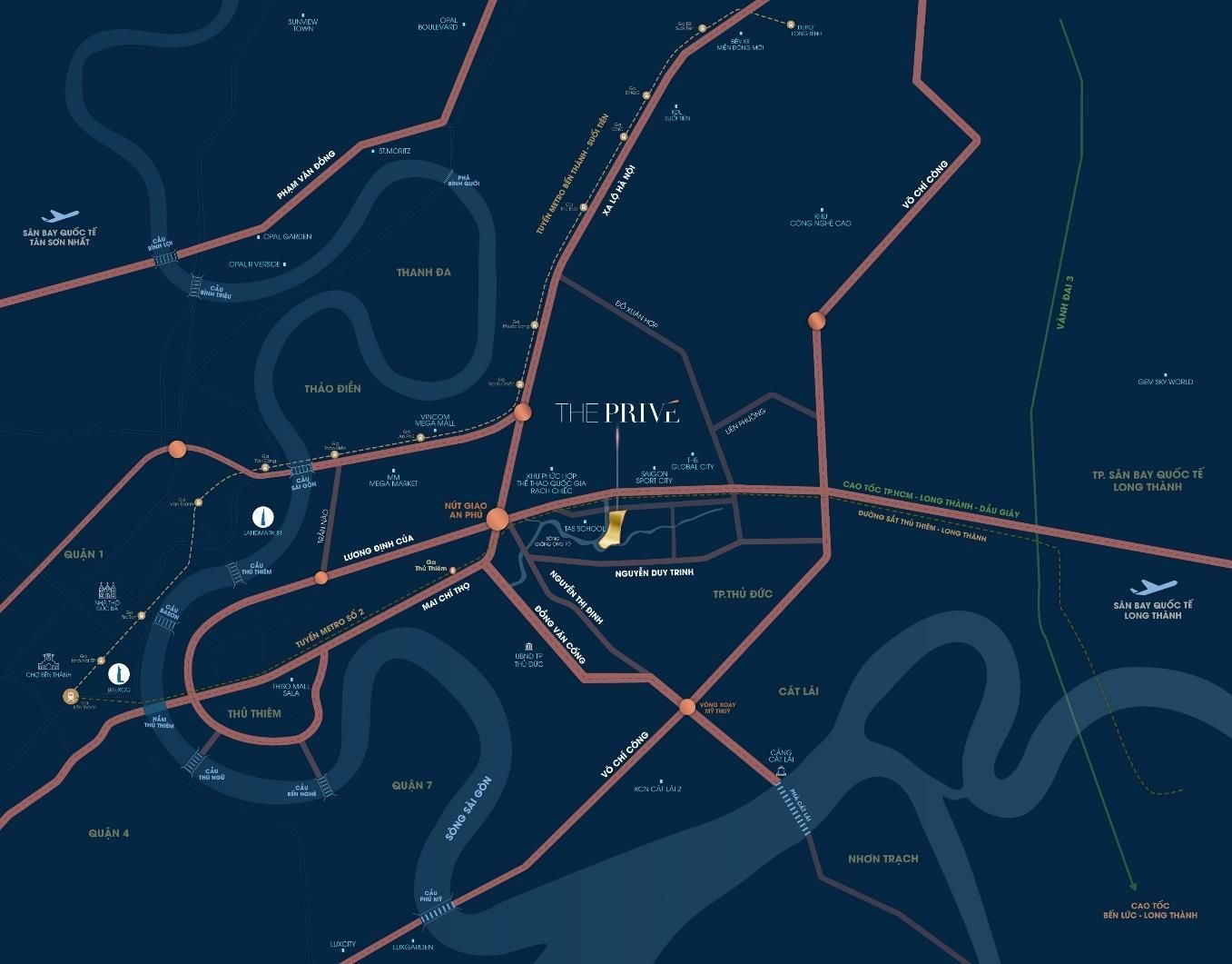 Located adjacent to the upcoming International Financial Center of Thu Thiem, The Privé stands as a new icon of luxury living and elite investment potential in Ho Chi Minh City’s most dynamic urban core. With prices still less than half of Thu Thiem’s, direct access to the Thu Thiem Metro Station and Long Thanh International Airport, residents enjoy seamless connection to District 1 in just 5–10 minutes and future metro access straight to Ben Thanh.