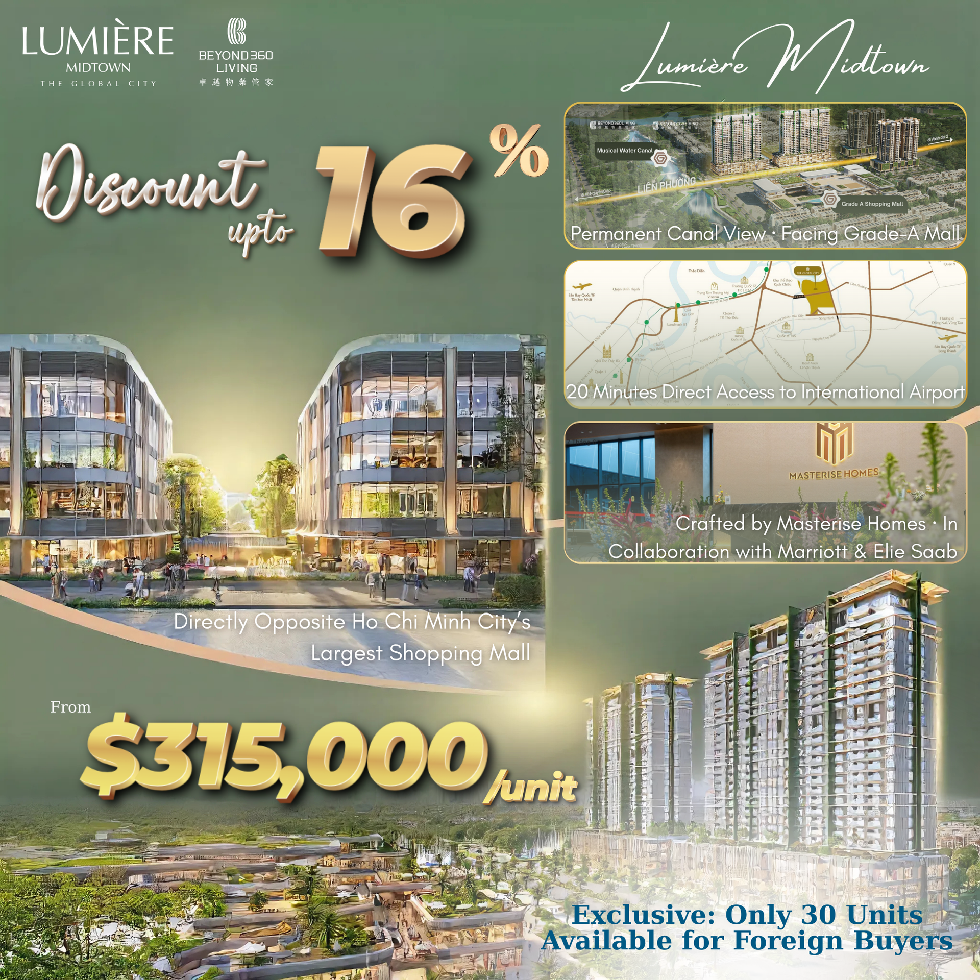 In the heart of The Global City, where global lifestyle standards converge, LUMIÈRE Midtown stands as an international masterpiece. With its “diamond location” at the crossroads of the vibrant commercial boulevard and iconic landscape axis, this luxury condo in Ho Chi Minh City redefines prestige for the new elite. As a trusted real estate partner, Beyond360 Living Vietnam offers investors exclusive access and tailored solutions to unlock the full potential of this landmark development.